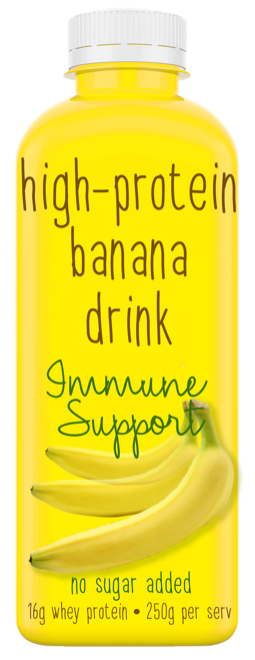 Ø香蕉口味乳清蛋白饮料(蛋白含量为6%)——这款产品使用了适合中性PH饮料的热稳定浓缩乳清蛋白Optisol ® 1007 ,同时含有能支持免疫健康的维生素预混料。